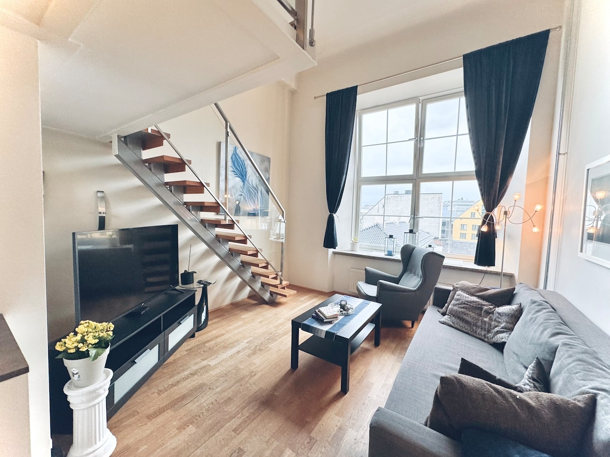 寬敞的閣樓公寓。 不受干擾。距離天花板5公尺。 大客廳,獨立用餐區。 1間大床房,配有雙人床和可供2人使用的折疊沙發。1間配有雙層床的臥室,可供2人使用。 2樓的獨立區域,配有雙人牀。 陽臺有座位。景觀非常好。 位於市中心,外面有4條巴士線路。 距離主要巴士站僅1站路程。 主火車站(奧斯陸S )距離2站路程。 免費車庫(必須預訂)。 僅限私人公寓。請安靜進出,尊重鄰居。