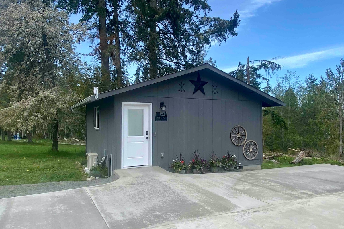 舒適的無臺階400平方英尺的單間公寓式小屋,具有開放式概念。 位於Sequim和Port Angeles之間的5英畝風景優美的景點,房客地理位置優越,靠近奧林匹克國家公園、徒步旅行和旅遊景點。 這間舒適的家外之家設有步入式淋浴間、全功能廚房(備有必需品)、空調和暖氣、室外露臺、大號牀、雙人沙發牀、電壁爐、電視和高速Starlink Wifi。 小屋由主要改造的材料建造!