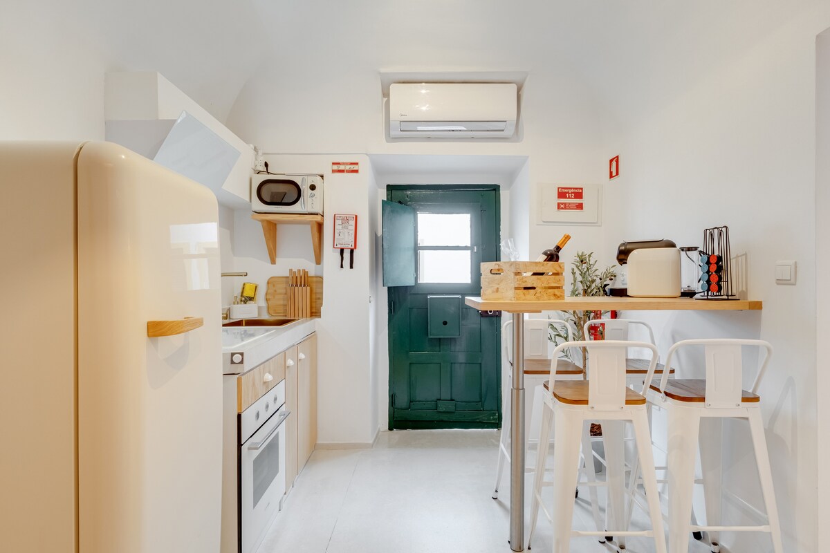The apartment features a comfortable bedroom with a double bed, a fully equipped kitchen for home-cooked meals, and a bright living area with traditional touches. Stay cool in the summer with thick stone walls and enjoy a quiet night’s rest in this tranquil neighborhood. Just a short stroll from the historic center, local cafés, and Moura Castle, this space is the ideal base to discover the rich culture, warm hospitality, and scenic landscapes of Alentejo.