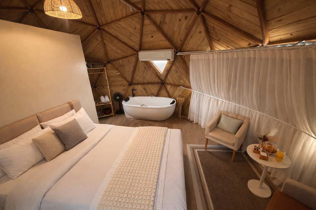 Viva uma experiência inesquecível no nosso Domo Geodésico Wine, um refúgio romântico em meio à natureza. Desfrute de banheira aquecida para duas pessoas, adega climatizada, lareira ecológica, fogueira externa, cozinha equipada, Smart TV e cesta de café da manhã. Acesso asfaltado, a 5 min do centro de Águas de Lindóia e 10 min de Serra Negra. Aproveite a vista das montanhas e o clima que tornam sua estadia marcante