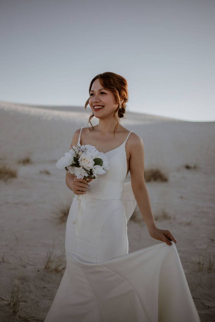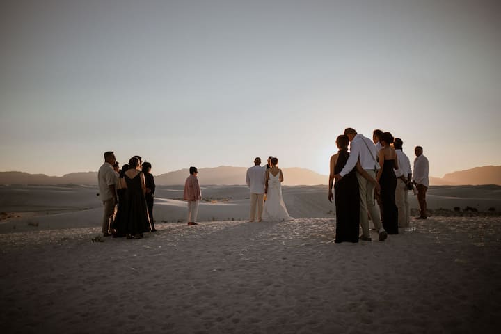 在白沙上舉行婚禮儀式。我們在沙丘入口會合,徒步前往僻靜的山脊宣誓並拍照,用氣泡蘋果酒乾杯,只留下腳印。輕鬆的指導,快速的回報。