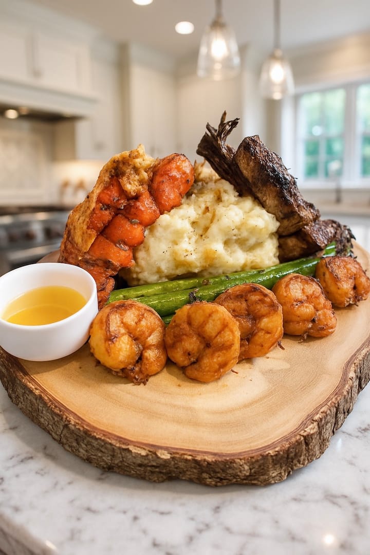 這頓餐點以高級菜餚為特色,例如烤肋眼牛排佐松露、大蝦和奶油龍蝦,配菜包括烤蘆筍和奶油馬鈴薯泥,全部精心擺盤。