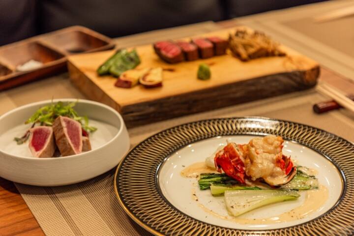 日本黑牛西冷牛排和當季海鮮就在你面前精心烤製並端上桌。