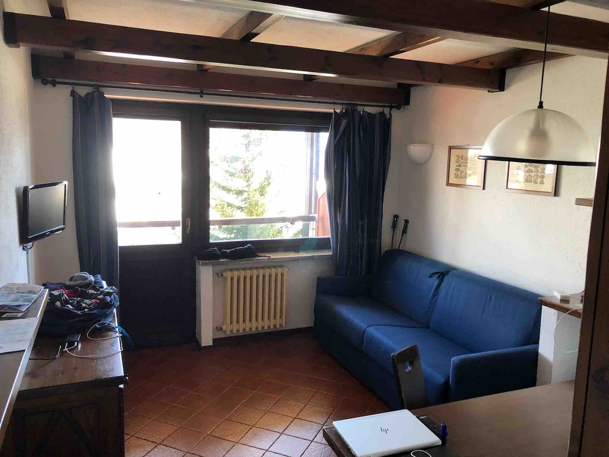 Con piscina.L'appartamento si trova nel Villaggio Olimpico, 50 metri dalle piste da sci. Ideale per chi ama sciare e la vita di montagna, giocare a golf e passeggiare. Può ospitare un massimo di 4 persone (una camera matrimoniale e un divano letto). L'appartamento dispone di angolo cottura attrezzato( macchina caffè LAVAZZA per capsule A MODO MIO NON FORNITE) camera letto conTV, un bagno con doccia e phon, soggiorno con TV, divano letto 2 posti, tavolo pranzo. Balcone panoramico con sdraio..