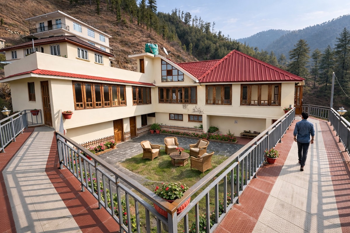 Exclusive Full-Property Buyout: Book 3 Ensuite Rooms (upper floor) with the Cozy Scent of Devdar Wood, Private Lobby & Orchard with 180° river views + Caretaker Service Exclusively for your group. Road-head access with free parking. Features: High-speed WiFi, pet-friendly orchard, bonfires & driver’s room. Explore: 📍2km: GHNP Gate (UNESCO) 📍2.3km: Choie Waterfall hike 📍11km: Bathad Waterfall 📍12km: Sarchi Meadows 📍2-min walk: Tirthan River Experience authentic Himachali warmth.