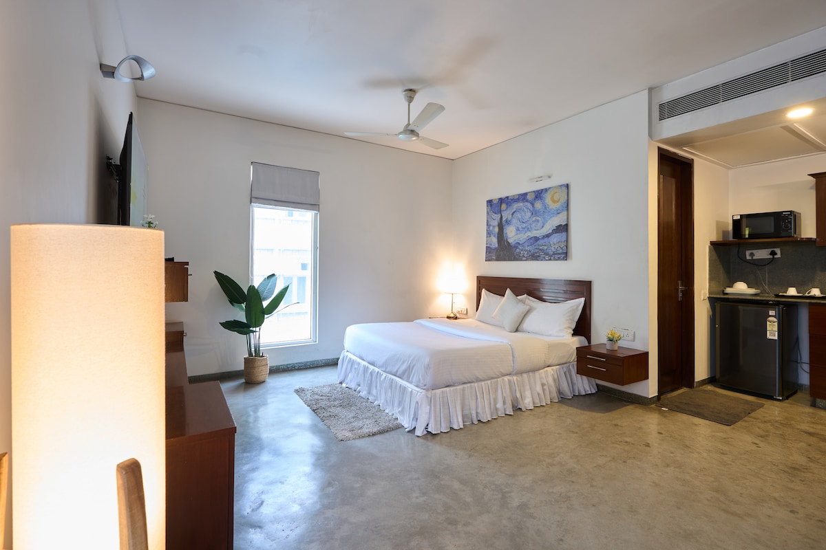 位於中央商業區或市中心的僻靜城市別緻單間公寓。光線充足、大窗戶、現代舒適的家具、配有爐具和煙囪的小廚房、鍋和平底鍋、水壺。現代化的浴室。私人單間公寓入口與我們的主屋分開。距離班加羅爾的所有熱門景點,如Brigade rd、MG rd、UB city、Forum mall等都只有幾分鐘路程。步行2分鐘即可抵達雜貨店,可提供送貨上門服務。提供Wi-Fi和智慧電視。帶著熱杯出門,享受露臺/陽臺。