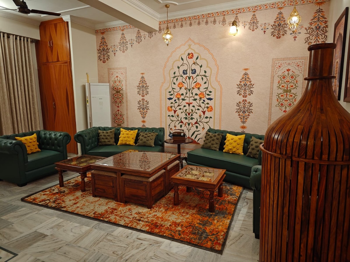 *抓住機會*入住位於一樓的美麗/豪華公寓,享受粉紅城的皇室生活,公寓裝飾融合了現代/傳統室內設計。 客廳有空調/2間臥室有空調(加大雙人床)/2間浴室/設備齊全的廚房。 巨大的露臺。角落房源,通風良好,所有基本設施。額外床墊/洗衣機(收費)。 充足的停車位/RO/監視器。 * RAJASTHAN政府旅遊部門註冊的住宿* * *價格實惠但奢華* *