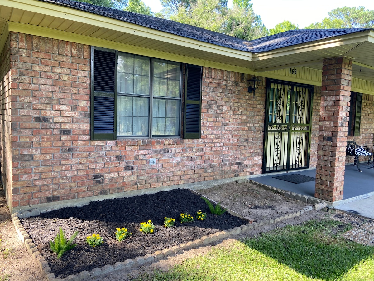 我們有一間以農舍為主題的客公寓,有自己的獨立入口和私人露臺,可透過東德州松樹林的樹木欣賞私人湖景。房間配有全新電器和咖啡吧。有一張非常舒適的加大雙人床和一張折疊床。有足夠的衣櫃空間。廚房備有碗碟和餐具。洗衣房也可使用。 此房源與我的房子相連,但我們是安靜的鄰居!