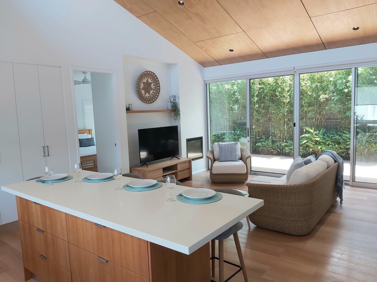 從這個時尚的起居空間欣賞一望無際的海岸景色,瞬間放鬆身心。這裡距離雪梨僅90分鐘車程,步行700公尺即可抵達七哩海灘。 打開折疊門,感受海風,將空間延伸到寬敞的露台。或者在寒冷的月份在壁爐旁享受舒適。 有早餐供應區和戶外休息區,您將有很多聚會的地方。您的狗可以在草地上奔跑,完全圍欄的院子,並在該地區的狗友好海灘享受時間。