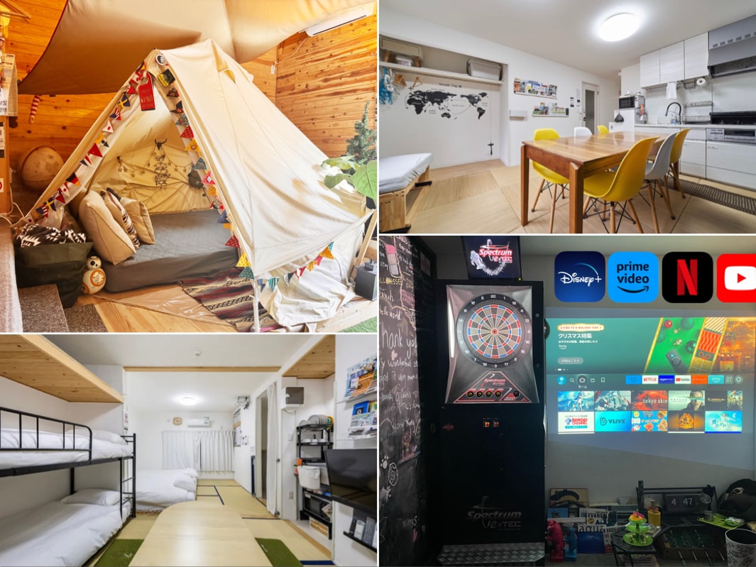 ãã®å®¿æ³æœèšã«èå³ãæã£ãŠé ããŠããããšãããããŸãïŒ 4åæ§è¿è¿œå æéãªãæž æä»£èŸŒã¿ã«ãªã£ãŠããããšãŠããããããã衚瀺æéã§4åæ§ãŸã§å®¿æ³ãå¯èœã§ã(Airbnbãµæå¥) 1éã¯å®€å ããã£ã³ã仿§ã«ãªã£ãŠããã°ã©ã³ãã³ã°ãã³ãããã§ã¢ãã³ã¢ãã¯ãããŒããã·ã³ã倧ç»é¢ã§ã®ã²ãŒã ãæ ç»éè³ãNetflixDisney+Amazonãã«ãŒããããŒãã²ãŒã 40çš®é¡ãªã©éã¹ãã¢ã€ãã ããçšæããŠããããã€ããšã¯éã宿æ³ã«ãªã楜ããäºãåºæ¥ãããšééããªã èŠ³å æ è¡ã®å©çšãã女åäŒã忥æ è¡ããµãŒã¯ã«ã®éããèªçäŒãªã©ã®ãç¥ãäºããããã¹ã¿ãžã¢ã ãè¿ãã®ã§éç芳æŠãªã©ã«ãã䜿ã£ãŠé ããŠãããŸã æŽã«åºå³¶é§ ããè¿ãããšããã£ãŠèгå å°ã«è¡ãã«ã¯ãšãŠã䟿å©ãªå Žæã«ãªã£ãŠãããŸãã芳å ã«äŸ¿å©ãªããŒã¿ãã«WiFiããçšæããŠããŸã ããåºå³¶ã«æ è¡ã«æ¥ãŠéšãéãäºããããšæããŸããéšå±ã§æ¥œãããå Žæããã£ãŠè¯ãã£ããšå®¿æ³ããã²ã¹ãããåãã§é ããŠãããŸã åšèŸºã«ã¯é£åããé ãªã©è²©å£²ããŠããè¬å±ãã³ã³ãããã¹ãŒããŒãã¬ã¹ãã©ã³ãã«ã©ãªã±ãããªã€ãŒããªã©ãããå å®ããŠããŸã æå€§12å宿æ³å¯
