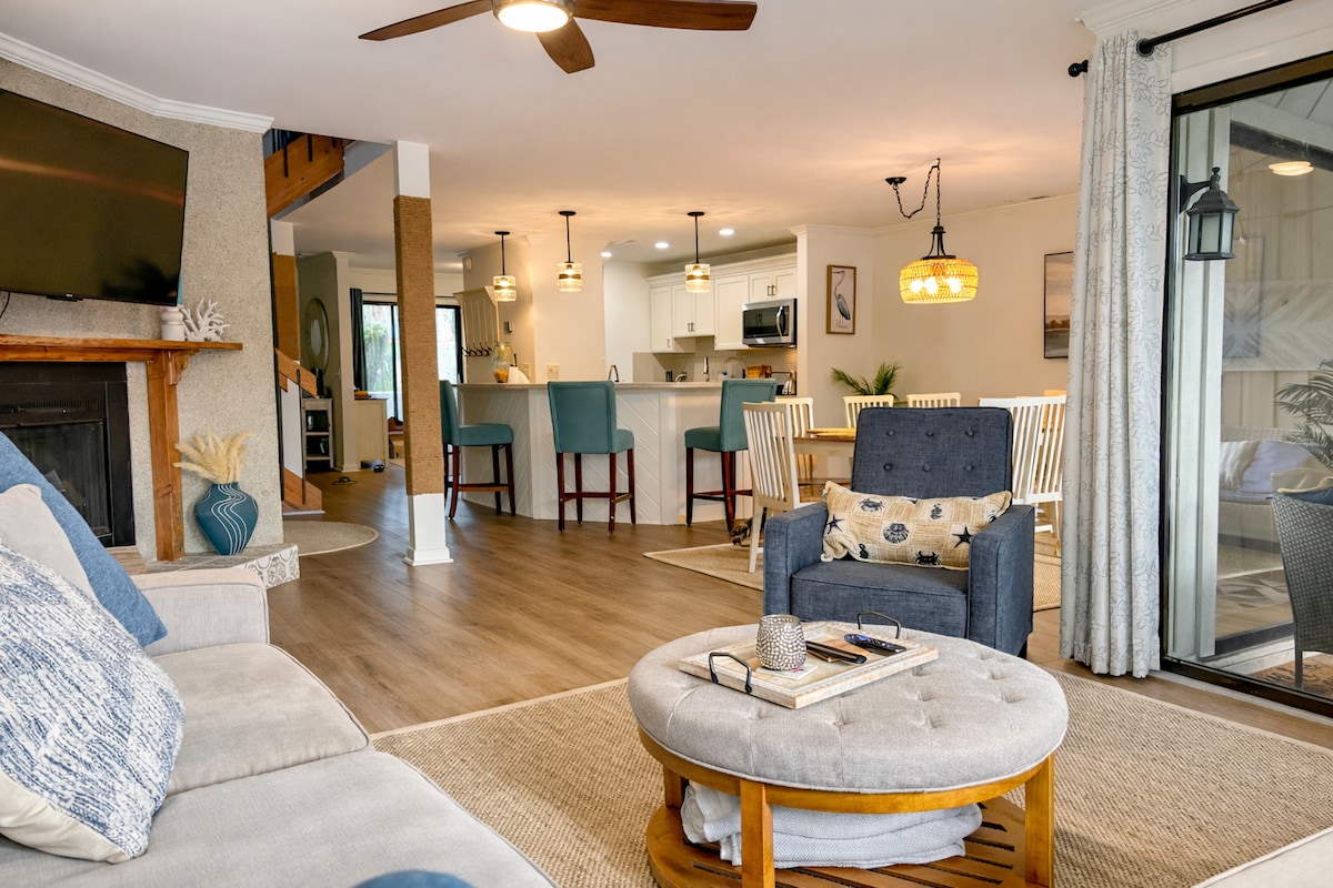 您找到了!您精美翻新、全新裝潢和寬敞的度假別墅配備您所需和想要的一切。這棟2層樓的聯排別墅有2間主臥室,配有私人套房、2.5間浴室,距離泳池、高爾夫球場、網球場、匹克球場、無盡的自行車道幾分鐘路程,開車5分鐘即可抵達12英里的白色沙灘。可輕鬆容納4位成人、2-3位兒童,並配備您所需的一切設備與服務。您的家外之家位於令人驚嘆的造船廠周圍,這是一個位於中心的有門禁的社區。