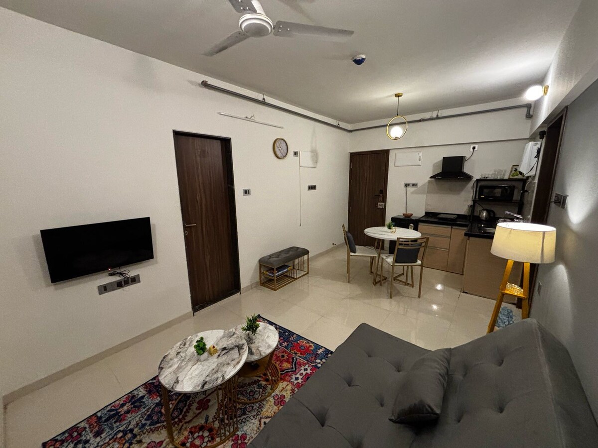 •舒適的生活空間:現代裝飾,配有豪華的雙人床、沙發和用餐區。 •設備齊全的廚房:非常適合烹飪或享用早晨咖啡。 •設備與服務:高速 Wi-Fi、平面電視和空調 •黃金位置:靠近公共交通工具、購物和充滿活力的夜生活。 無論您是探索浦那的景點、品嚐當地美食,還是放鬆身心,這套單間公寓都配備了您難忘住宿所需的一切設備。 立即預訂,享受完美的度假體驗!