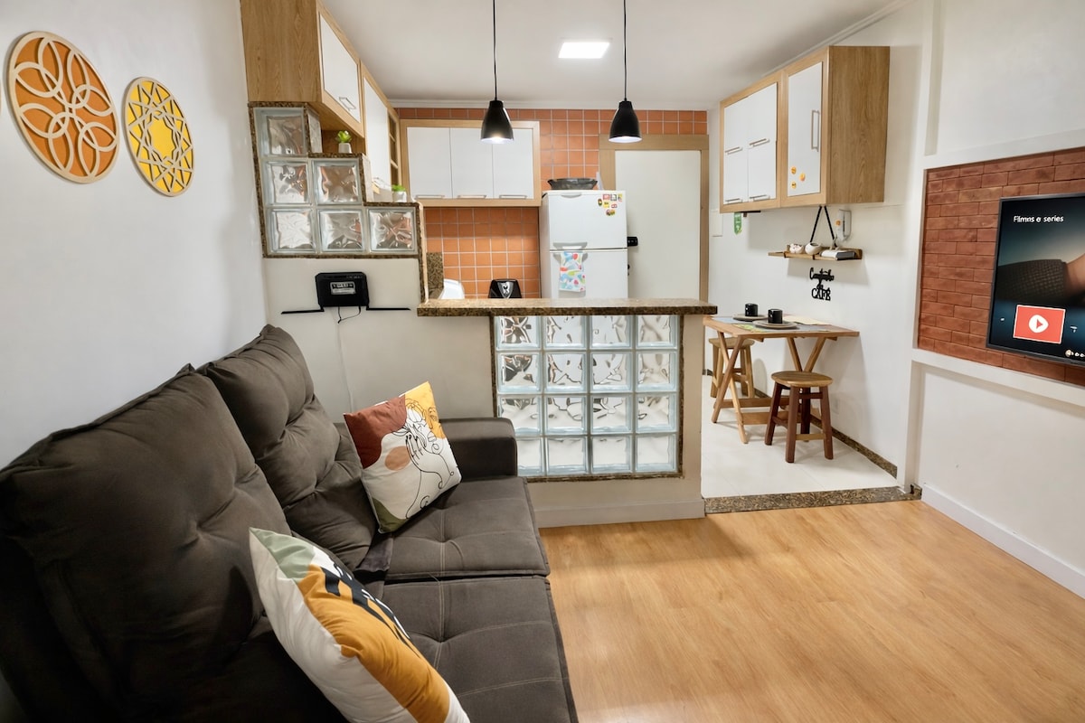 想像一下,打開門,驚訝地發現一個充滿舒適和時尚的空間。 這是一套兩房公寓(其中一間是套房);是一顆真正的寶石,最多可容納6人,舒適而溫馨。 如果您正在尋找一個有家的地方,您剛剛找到了! 最棒的是:它位於城市的戰略位置,在高貴的Enseada do Suá,您可以輕鬆前往維多利亞和維拉維爾哈的主要景點。