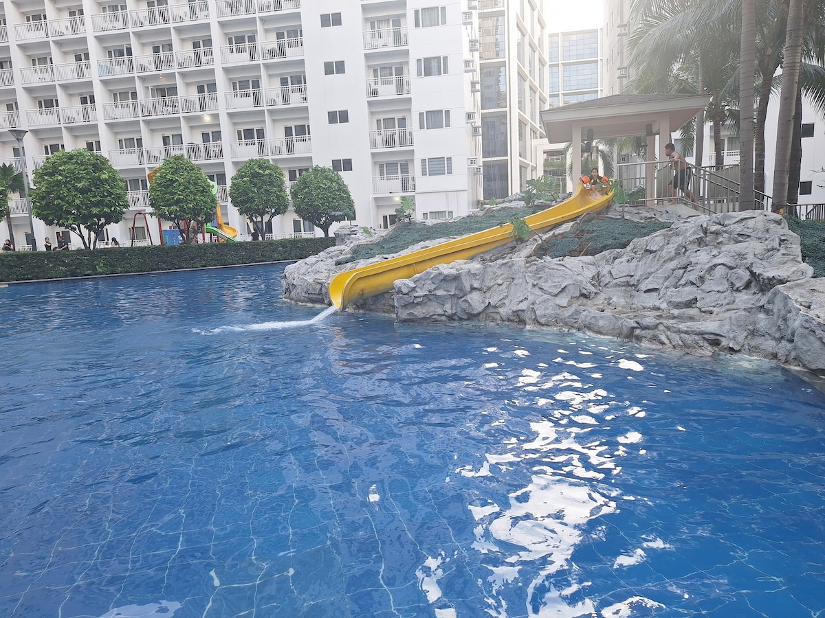 Wake up with the tropical palms as ur view from ur bed thru glass door. It has Queen bed & hotel quality ortho mattress, pillows and linen for luxury sleeping experience. Equipped with your basic kitchenette needs. 800m from Mall of Asia, 20 mins from airport, Theatres, Esplanade, With alfamart, Starbucks & restaurants at the ground. Pool is accessible for a fee. Jump off straight from your balcony to the pool after pre registration and easily access back your unit by dedicated step.