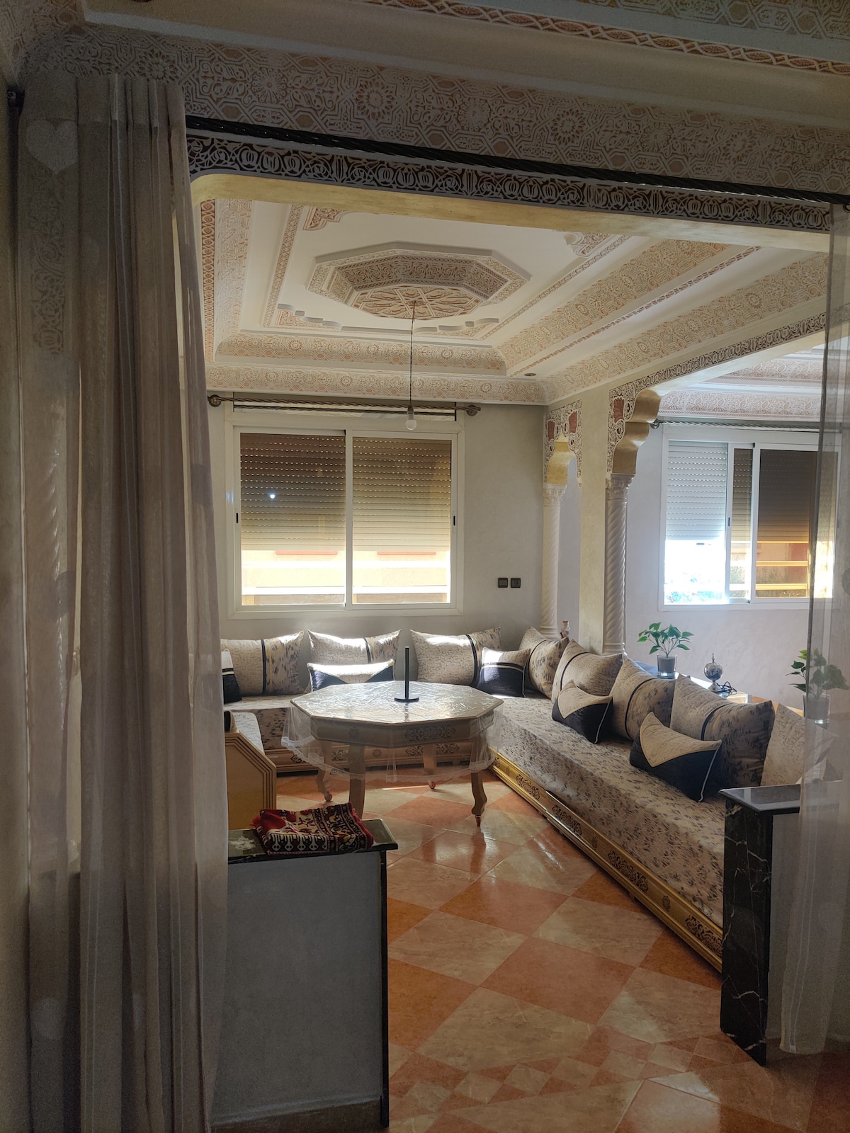 我在Sidi Slimane 100 m租了一間公寓,短期租賃,日租, 2間臥室, 2間客廳,大廳,廚房,淋浴間,家具齊全,可俯瞰超級安靜的景觀,靠近所有便利設施,距離清真寺2分鐘,距離市中心5分鐘。 享受這個美妙的房源,提供美好時光。