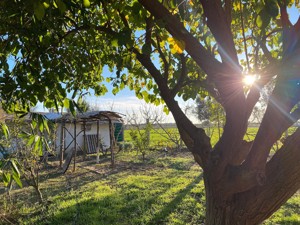 casa con jardín en un espacio natural para disfrutar de la naturaleza y desconectar del ruido de la ciudad, la casa cuenta con un salón grande,2 dormitorio, un comedor, una cocina y un baño, con un espacio en el césped para comer o jugar y un gran jardín lleno de árboles de naranjas limón,melocotón,uvas y más hierbas 🌿