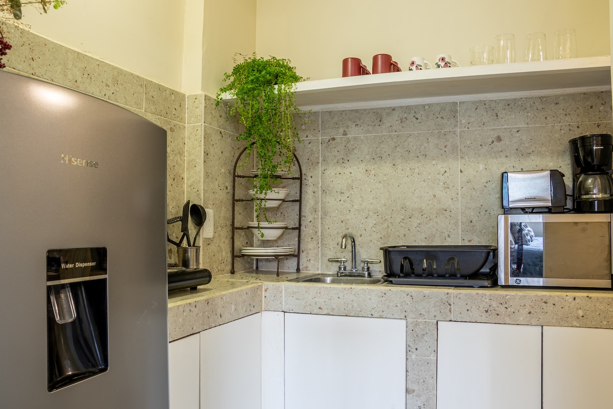 This Loft has an excellent location to go to the beach and walk along Av Camarón. It is in a quiet and safe neighborhood, perfect for short and long stays, everything is accessible by foot. Private, very clean and with all the amenities, air conditioning, high-speed internet, TV, Netflix, own bathroom, full kitchen, coffee maker, desk, closet, washer and dryer, fan, garden areas, etc. You're going to love it!