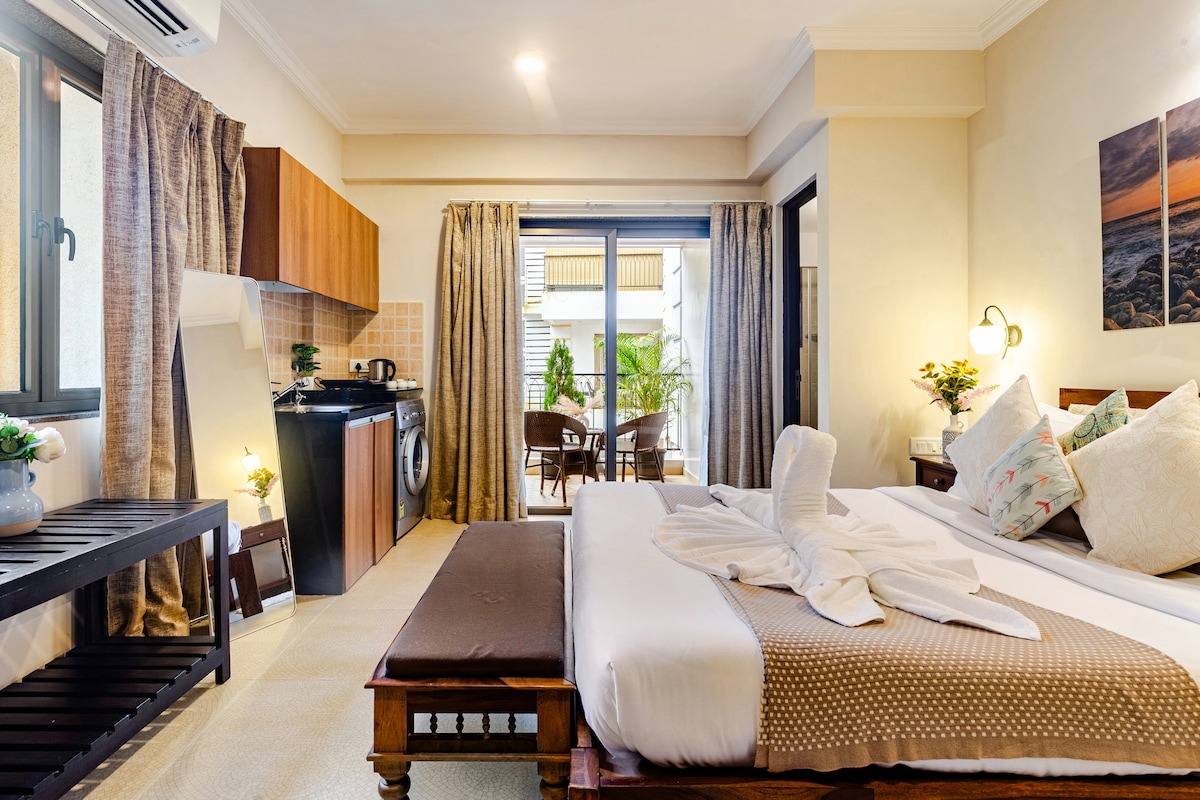 這間精心設計的 1 房 1 衛公寓位於迷人而綠意盎然的 Siolim 村,為尋求真正果阿體驗的旅客提供舒適、時尚和寧靜的完美結合。 無論您是情侶浪漫度假、獨自探險還是數位遊牧,這個舒適的空間都能幫助您放鬆身心,恢復活力。公寓是有門禁社區的一部分,有24小時保安、游泳池和郁郁葱葱的景觀。 高速 Wi-Fi 讓住宿更加便利