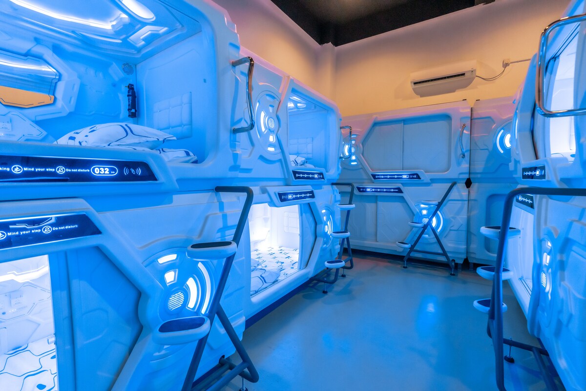 The upper double capsule at Jyu Capsule Hotel offers a private upper-level pod with a spacious double bed, perfect for solo travelers or couples. Enjoy modern comforts like personal lighting, charging ports, and access to shared facilities, all in a unique and peaceful setting. Ideal for those seeking both comfort and a little extra room during their stay.
