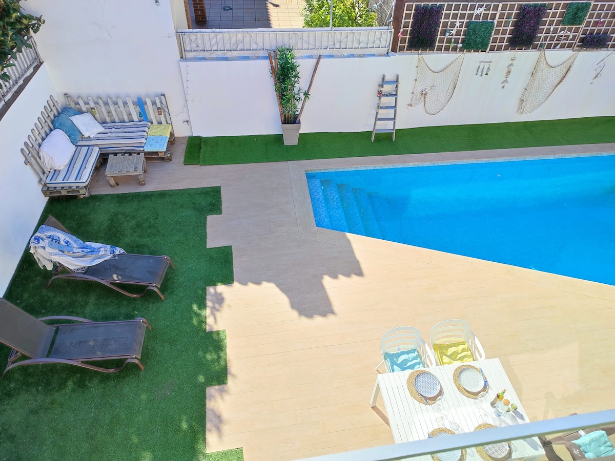 如需長期住宿,請與我們聯絡! HHBCN海灘別墅Castelldefels #3是位於巴塞隆納旁邊的度假屋,就在海灘上。房子配有私人泳池、停車位、空調,並配有家庭設備。共有四間臥室,其中兩間是套房,共有三間浴室。* * *樓上露臺無法使用,完全禁止在露臺和外面的樓梯上行走* * *泳池旁的露臺可供使用