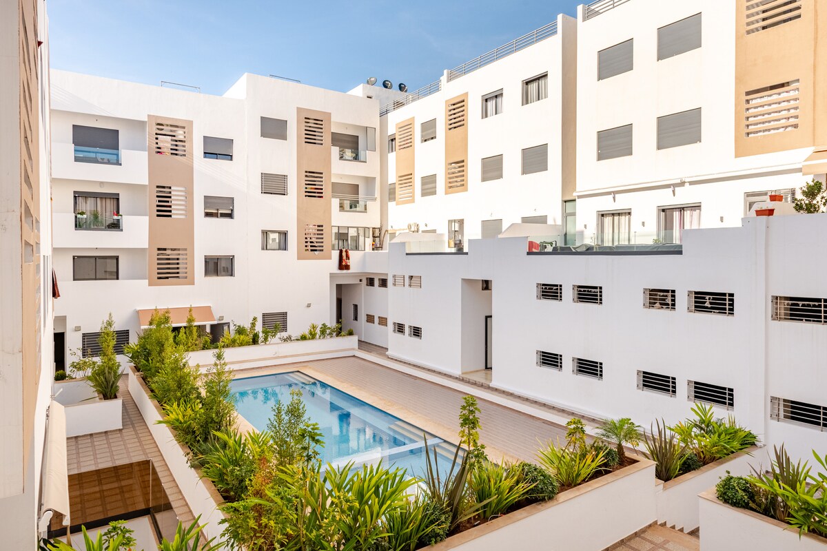 在這個寧靜祥和的中心住宿中,簡化您的生活。 位於Hay Riad商業區的中心。 距恩納基爾大道( Ennakhil Avenue ) 2分鐘路程。 距離拉巴特第一家露天購物中心Mahaj 2分鐘路程,這裡有許多即食咖啡館、餐廳、餐廳、快餐店、快餐店和披薩店 如果您是步行支持者,您會在植物公園附近找到