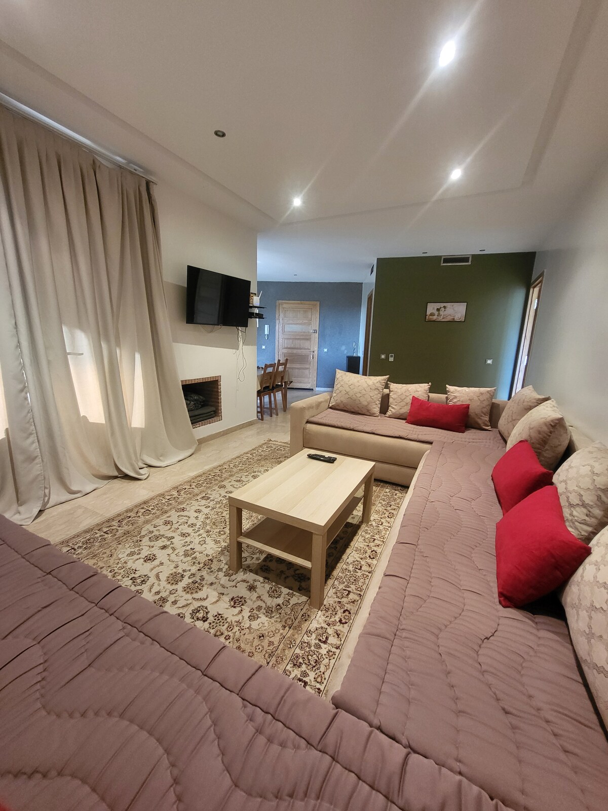 歡迎來到這間160平方公尺的美麗新公寓,位於Harhoura的熱門Val d 'Or區,在有門禁和安全的住宅區。 距離海灘幾分鐘路程,是融合真實、放鬆和現代化的理想住宿地點。 每個空間都經過精心設計,結合傳統的摩洛哥魅力(織物和木板)和現代舒適。 公寓明亮、安靜,非常適合接待家庭、團體或遠程旅客