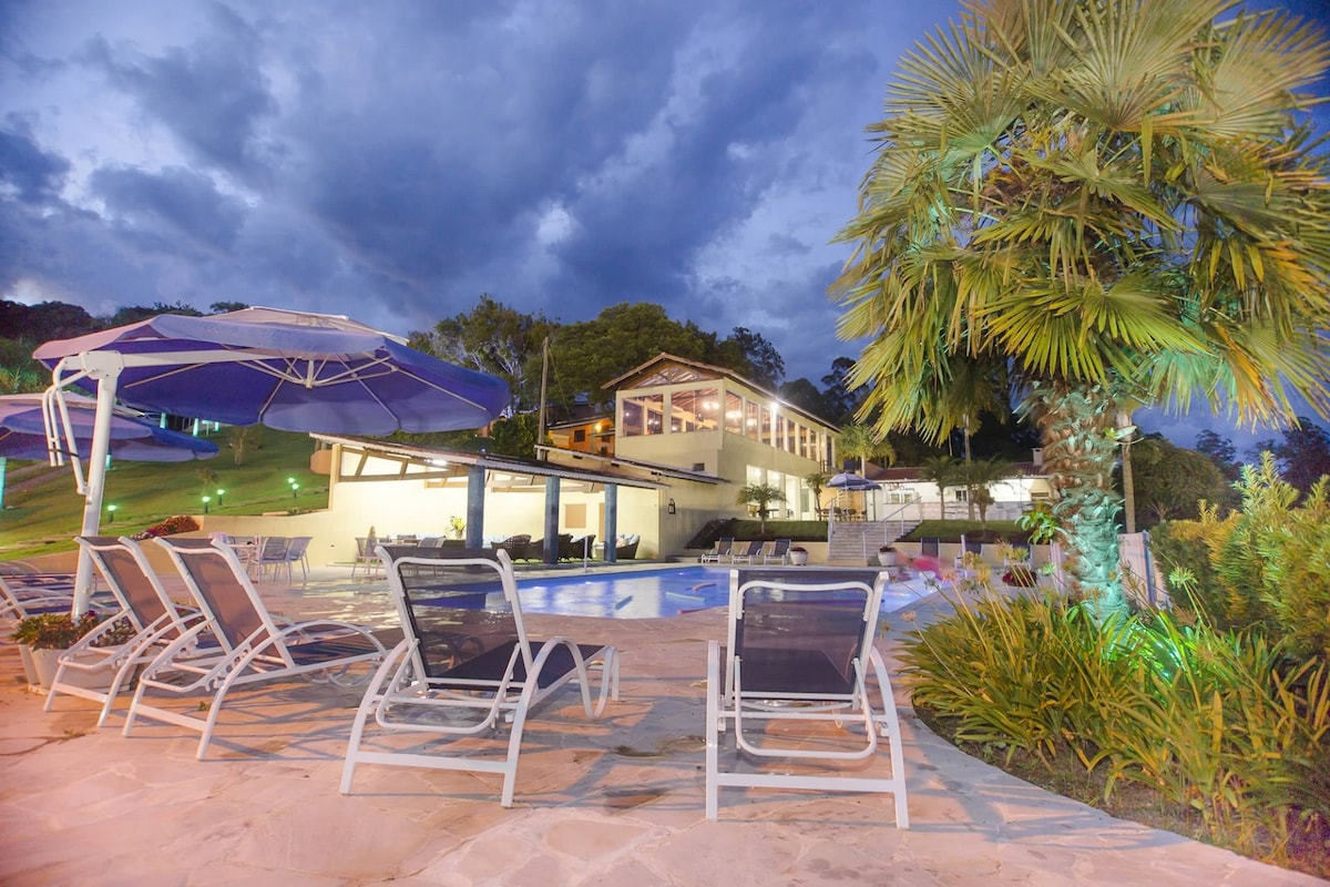 Venha desfrutar de deliciosos momentos com toda sua família. Garantimos uma cozinha super equipada!Em meio as montanhas no vale das Aguas.Paz e natureza possibilitarão momentos inesquecíveis! Contato com animais,piscina, jacuzzi ,decoração moderna,aconchegante e com todo conforto,camas de primeira em nossa casa de campo. Durante a semana você poderá fazer seu home office pois nossa internet é ótima! Estamos a 5 km do centro! Quartos com ar/condicionado e Piscina climatizada eNÃO tem Pernilongo
