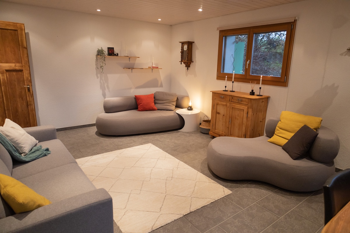 Abgeschlossene Wohnung mit eigenem Eingang, Badezimmer und Küche. Es gibt ein Doppelbett im Schlafzimmer und eine Couch im Wohnzimmer, dazu kann ein Einzelbett sowie eine Matraze aufgestellt werden. Sauna kann auf Anfrage benutzt werden (Fr. 15.-), im Carport ist eine Aufladestation, die auf Anfrage genutzt werden kann (Fr. 10.-/Nacht).