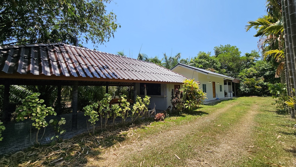 我們的房子坐落在叢林深處,毗鄰一個植物園和國家公園,旁邊有一條流向Thale Noi和Songkhla湖的寧靜河流。 適合大自然愛好者! 您可以觀鳥、乘坐長尾船穿越蓮花、在水牛背後欣賞日出,或在雨季體驗獨特的水上生活方式。 這棟房子設計簡單,非常適合那些尋求簡單生活方式的人,如果我們不在,當地社區會熱情款待您。