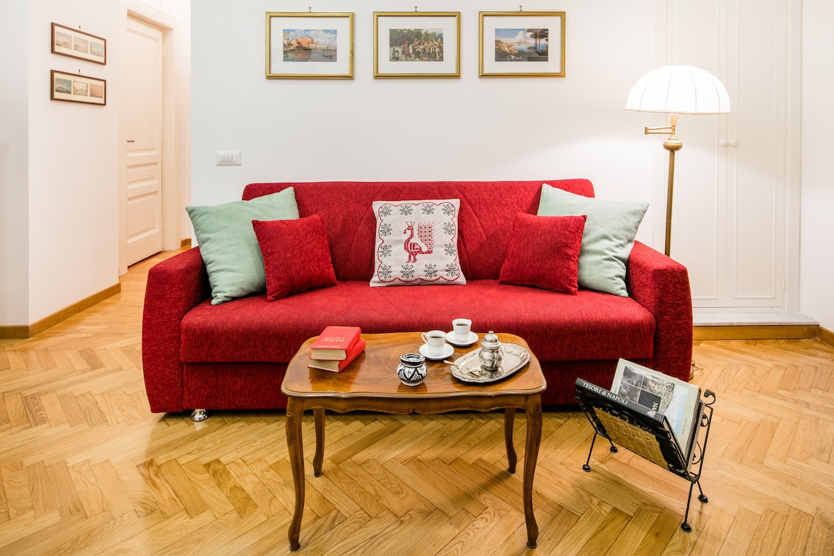 公寓距離Amedeo廣場(地鐵L2、Funicular、計程車站)步行僅需3分鐘,最多可容納5位房客,並提供所有舒適的設施,讓您在歷史悠久而優雅的Chiaia區中心地帶放鬆身心。 主要空間是:兩間舒適的臥室、一間配有沙發床的寬敞客廳、一間獨立衛浴和一間明亮、設備齊全的廚房。 從1909年開始,室內裝潢充滿了自由風格的木門和框架,和諧地平衡了鄉村優雅與現代設施。
