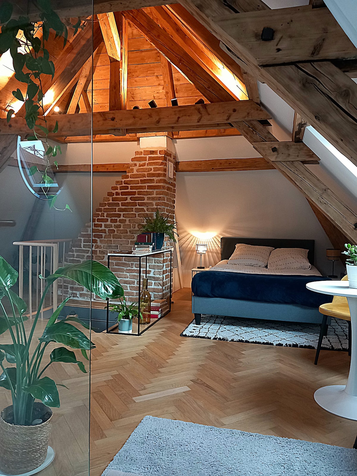 坐落在中世紀城市Munster的屋頂上的一間小型、非典型和舒適的單間公寓。 非常適合想在美麗的單間公寓中探索阿爾薩斯的遊客,將木屋閣樓的溫暖與現代閣樓設計的優雅融合在一起。 單間公寓設備齊全,可供短期或長期住宿,配有開放式廚房、客廳/餐廳、現代化浴室、臥室區域和圖書館。