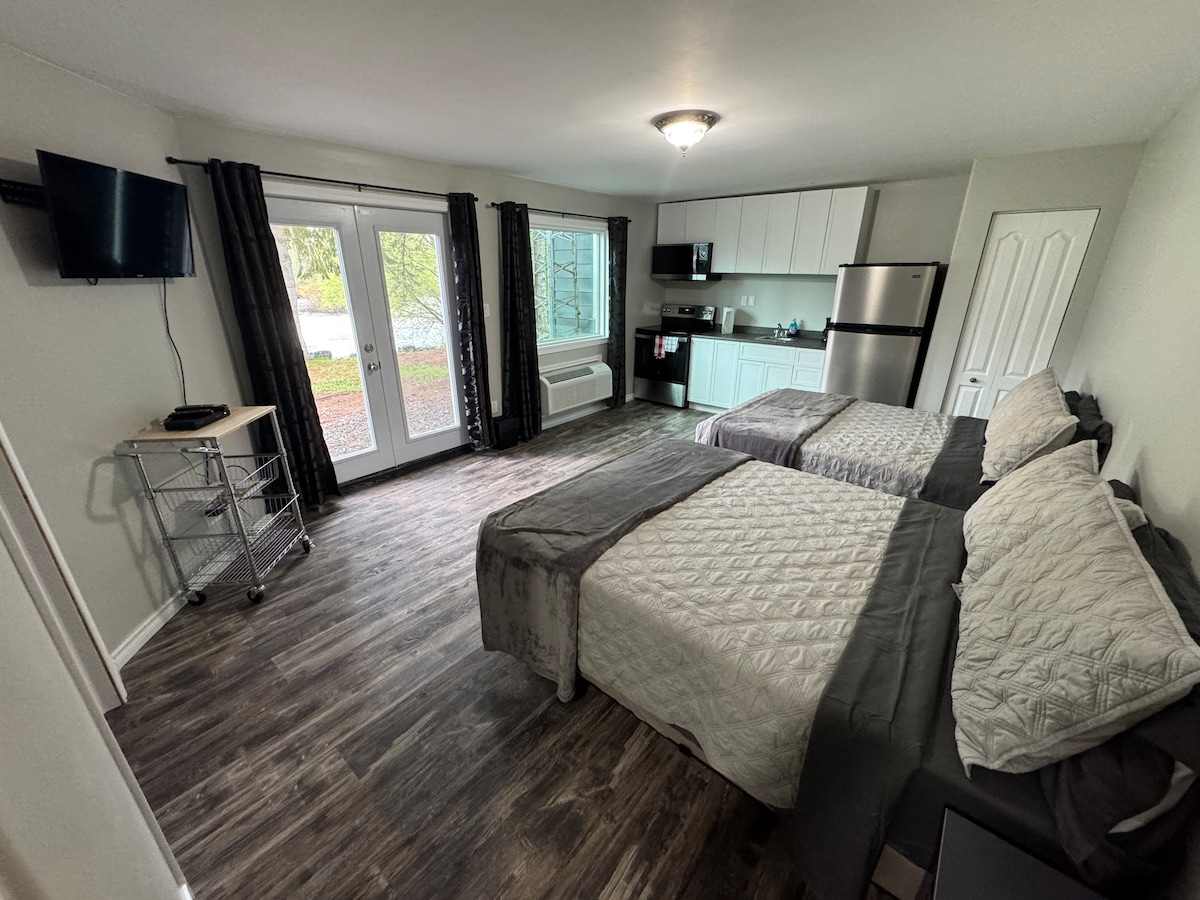 這間海濱公寓設有私人露臺,是2025年春季全新翻修的! 2號房是一間單臥室公寓,配有兩張雙人牀、無障礙三件套豪華浴室,以及配備全尺寸冰箱、爐竈、微波爐、咖啡機和空調的廚房。 享受配備衛星服務的電視、免費Wi-Fi ,並免費使用美麗的馬達瓦斯卡河畔的野餐區域和火坑。