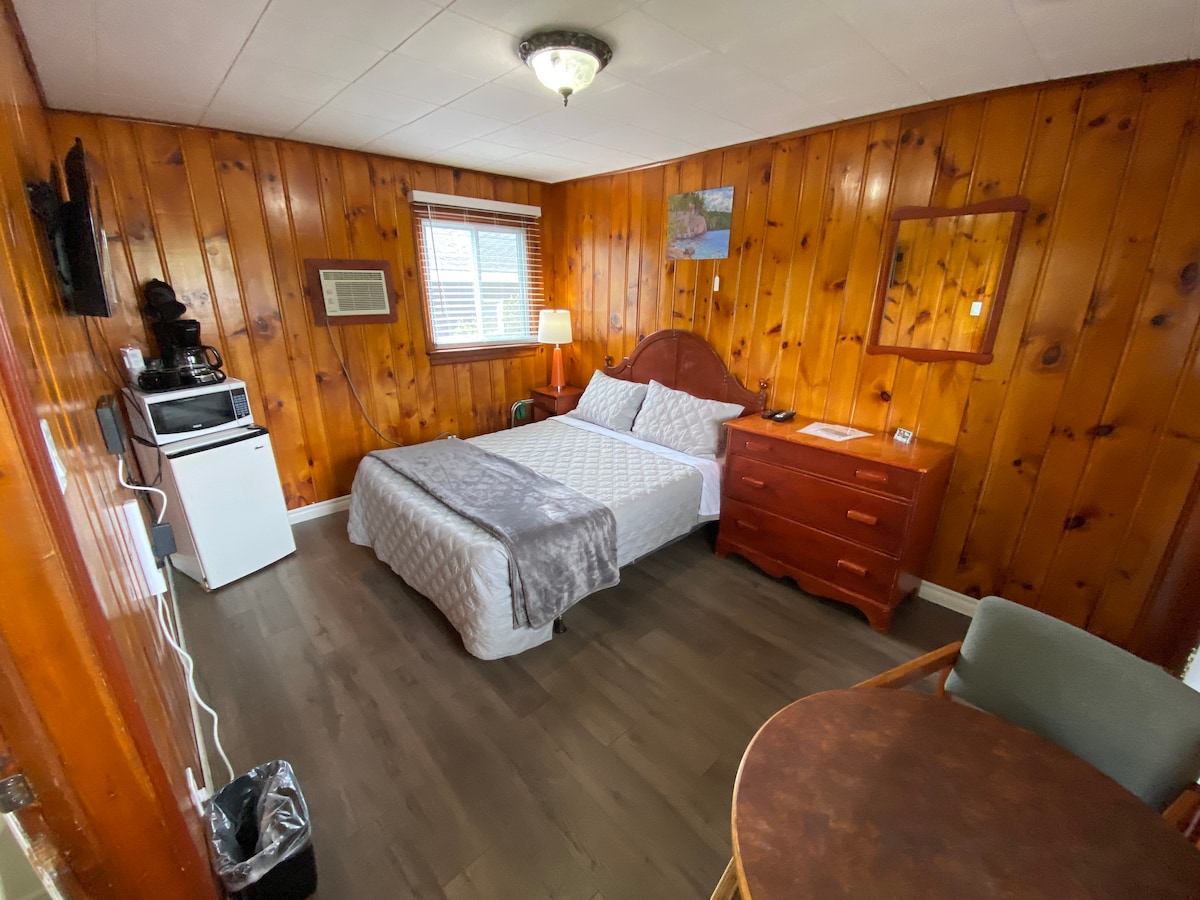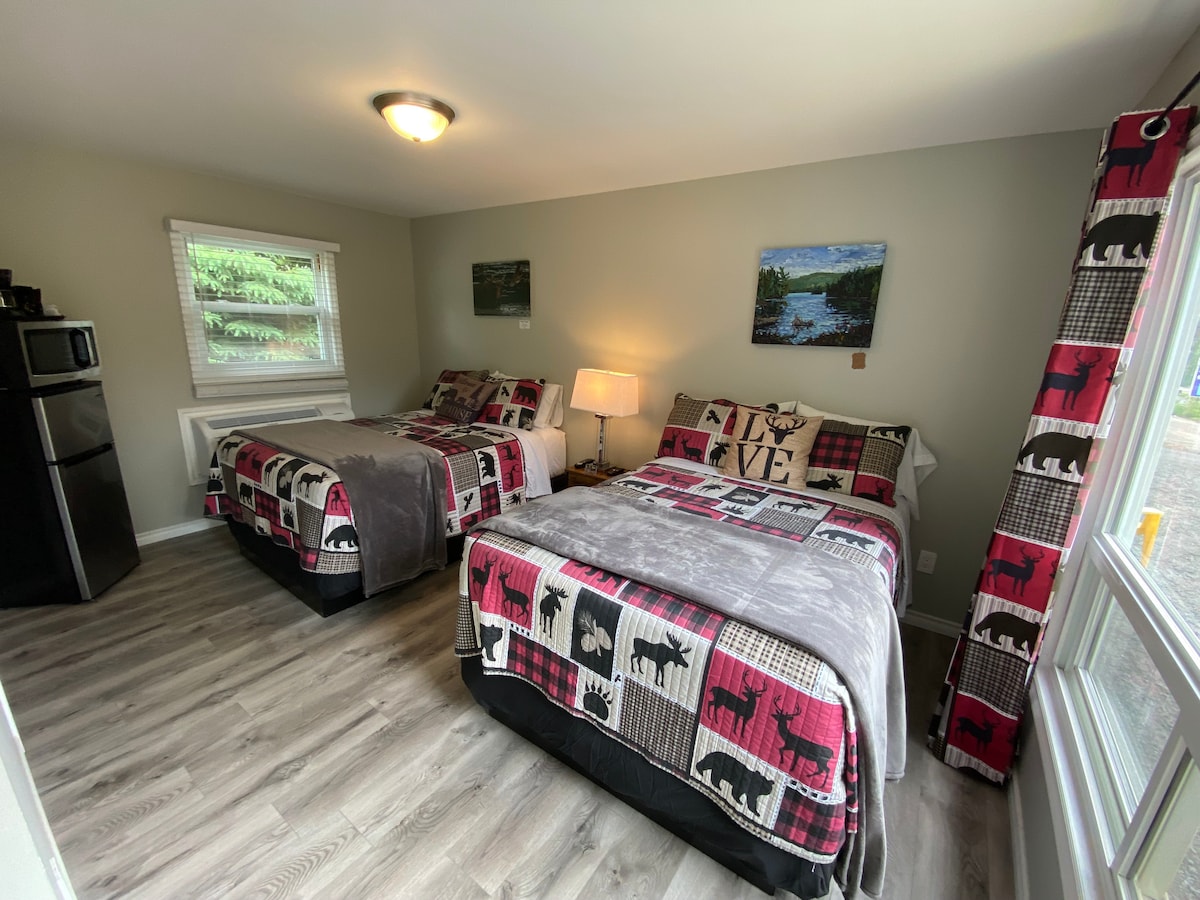 Room Six features 2 double beds with a small 3 piece bathroom that is equipped with a toilet, sink and shower. All of our rooms include a microwave, coffee maker & Bar Fridge, Air Conditioner, Electric Heat, TV with satellite service, Free Wi-Fi, Free Parking and free use of our picnic area with a fire pit that is located on the shores of the breathtaking Madawaska River. This room doesn’t face the water, but the waterfront is just a short walk away on the property.