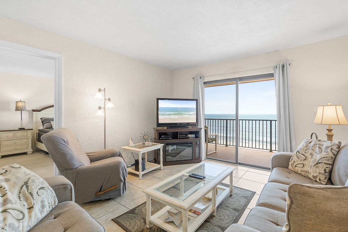 由於大樓裝修限制了我們的陽臺使用,每晚價格降低。 目前無法進入陽台,景觀將受阻*。 在海灘上!您在Daytona Beach Shores的舒適寬敞單間公寓是Daytona的寧靜海灘,距離各種活動和餐廳僅幾分鐘路程。 我們的6樓單位已完全改造,配有免費專用45 + Mbps WiFi、全套小廚房和免費停車設施。 *我們的陽台在4月前無法使用。