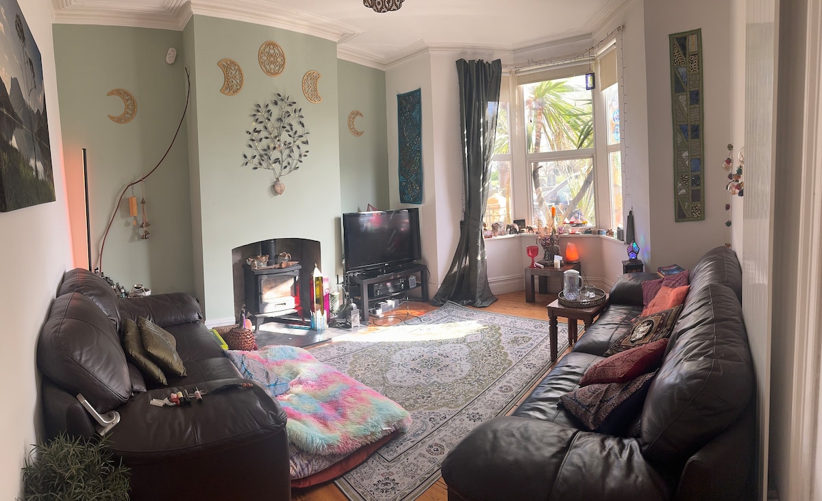 Cozy single room in a bright, crystal-filled home with high ceilings, a log burner & healing energy. The room has a desk, studio mic & soundcard—perfect for work or music production. Enjoy the garden & 2 friendly cats. Your host, a Reiki practitioner & music producer from Canada, creates a welcoming, inspiring space for rest, creativity & good vibes.
