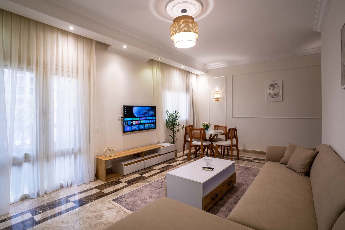 歡迎來到全新、設計精美的單臥室公寓,位於The Village, Palm Hills,步行2分鐘即可抵達Point 90 Mall。 餐廳、咖啡廳、商店和日常必需品都在隔壁。 這間80平方公尺的公寓位於一樓,設有私人花園和戶外座位,非常適合情侶、長期或短期住宿和寵物友善的生活。