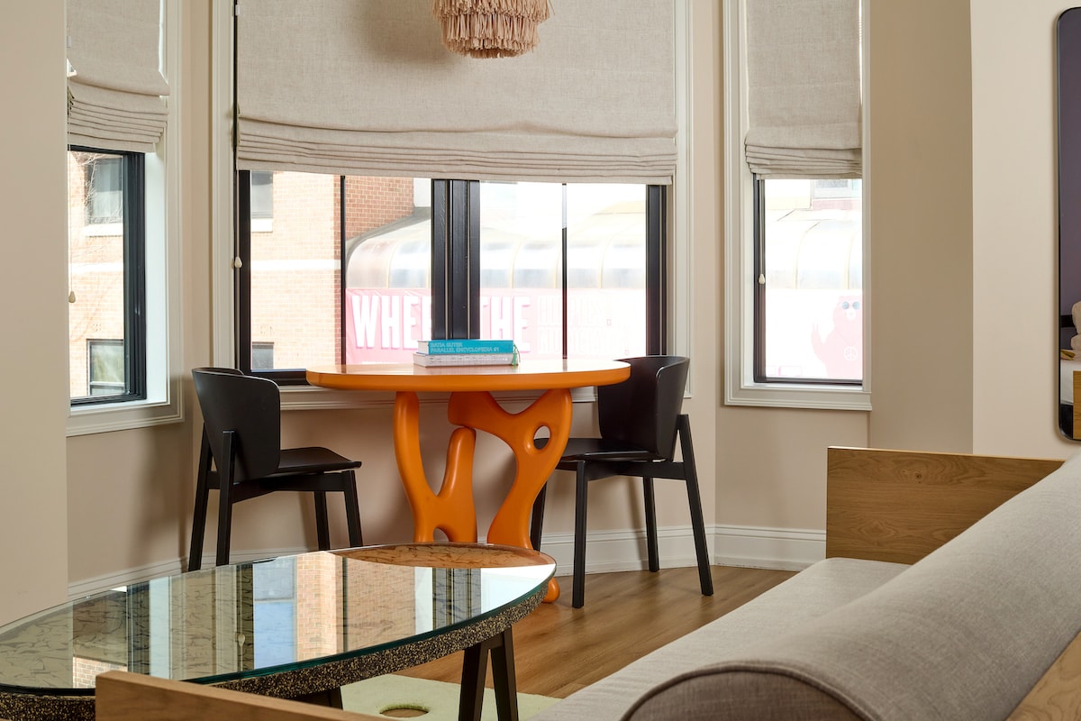 Imagine a hotel suite that transforms from a sunny daytime haven to an inviting evening retreat. Our corner king offers an open-concept design that seamlessly blends functionality with style. Bathed in natural sunlight, this suite features a spacious King bed, a versatile living room, and intimate dining area. The kitchenette invites you to craft signature drinks or stay in for dinner. Unique architectural shapes harmonize with unexpected pops of color, making this space truly one-of-a-kind.