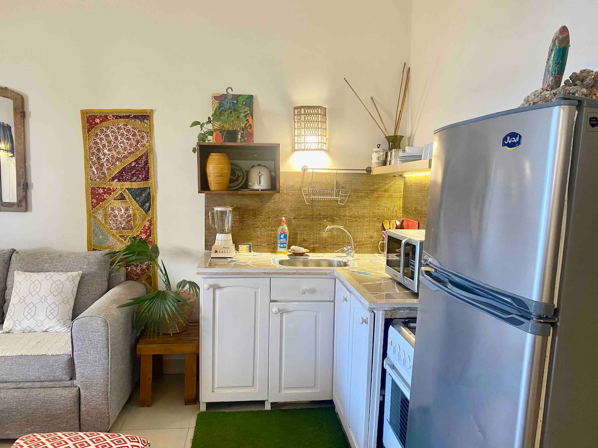 這是一間位於達哈卜的波西米亞風格小木屋,在 Eel garden 可欣賞海景,距離珊瑚海岸僅幾步之遙。這間度假屋有兩間舒適的臥室、開放且時尚的接待區,以及可欣賞絕美海景的迷人屋頂。室內設計溫馨,散發著波西米亞風情,自然裝飾和大地色調營造出平靜放鬆的氛圍。這裡是放鬆身心、享受大海和大自然美景的完美之地