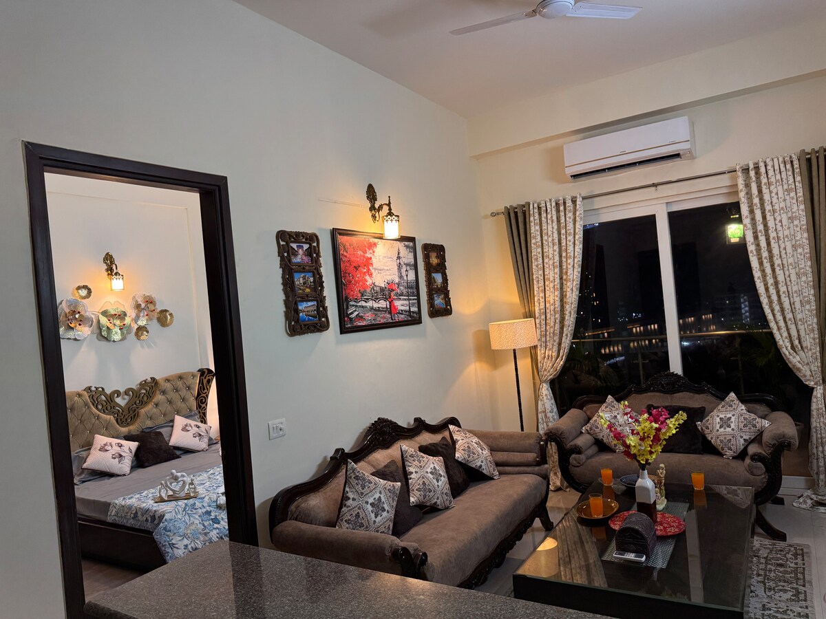 這間位於市中心的豪華雙臥室服務式公寓配有大陽臺,可欣賞Ggn天際線的美景,並在日常生活中為您的身心提供適當的寧靜。 位於有門禁的建築羣內,配有24小時保全。 地鐵站、一些令人驚嘆的美食店、商場、網路、高爾夫球場路,最重要的是,酒吧距離這個地方僅一步之遙。 每日客房清潔服務,確保舒適住宿。