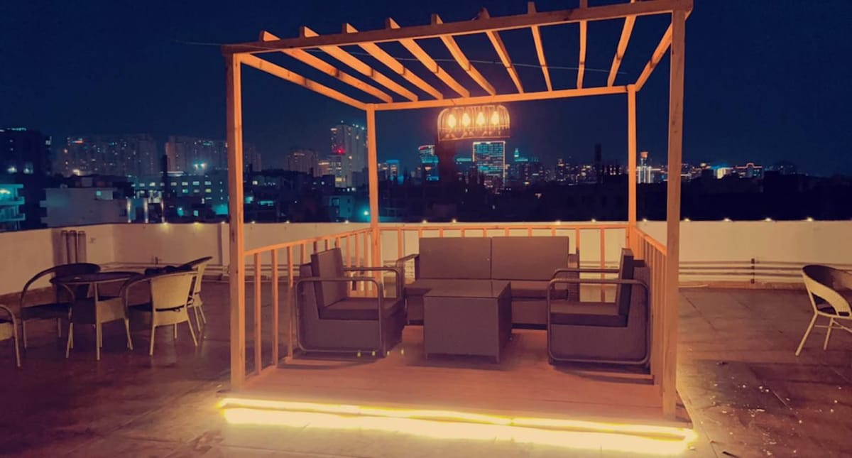 歡迎來到我們位於高樓大廈15樓的驚人套房。這間2bhk是全新的公寓。 寬敞的私人露臺,可欣賞城市天際線景觀,獨一無二。此房源非常適合放鬆身心,欣賞現代建築的美景。公寓配有3臺智慧電視(所有應用程式都可使用)、2張舒適的雙人床、2個帶儲物櫃的大衣櫃、6人沙發、時尚咖啡桌、熨衣板、冰箱、微波爐、電磁爐、電熱水壺、烤麵包機等