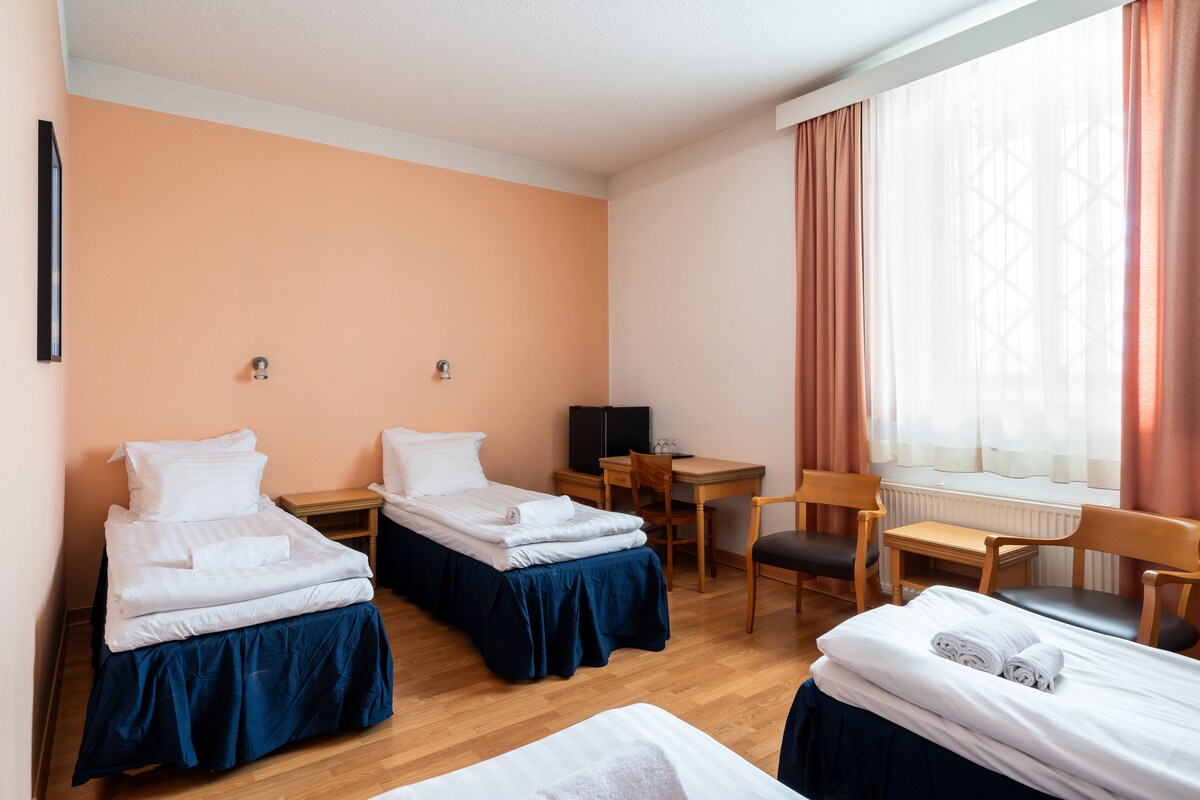 Winter offer free parking for hotel guests until end of March 2026. Homelike hotel room with great amenities at Hiisi Hotel Turku Seaport in Turku Harbour. The room featuring 2 single beds is suitable for up to 2 persons. Work desk and chair and an ensuite bathroom, a flat-screen tv and WiFi. All rooms feature a mini fridge. Linen, towels and final cleaning are included. No breakfast, reception or air-conditioning. Please note rooms are on the 2nd floor and the hotel has no elevator.