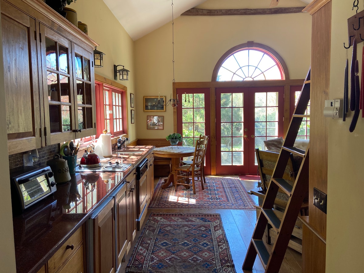 私人客用住房,佔地5英畝以上,以及歷史悠久的殖民地房屋。 明亮陽光充足,俯瞰泳池和花園(季節性)。 高效率廚房,配備2個爐子、微波爐、冰箱/冰櫃/製冰機、洗碗碟機、花崗岩檯面。 用餐區、高天花板的大客房、通往私人露台的法式門、硬木地板。 閣樓配有全尺寸床,沙發可作為雙人床使用。全套浴室和超大淋浴間。 狗友善(需要批准)。