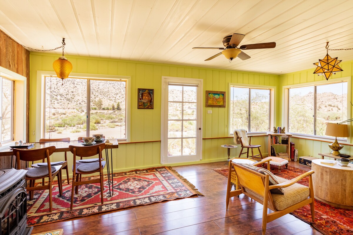 The Joshua Tree Green Haus is a beautiful secluded vacation retreat located on a mesa overlooking the Joshua Tree National Park. Enjoy an amazing 180 degree view of the National Park, Mt. San Jacinto and Mt. Gorgonio as well as the spectacular night sky while soaking in our outdoor cedar hot tub. The house is surrounded by untouched rocky Mojave desert terrain perfect for hiking and exploring.