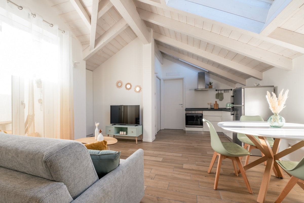 Appartamento deluxe in mansarda con ogni tipo di comfort come lavastoviglie, doccia, Jacuzzi, riscaldamento e condizionamento. Arredamento moderno e con un tocco di raffinatezza. Terrazzo a Sud adiacente al salone da pranzo con tavolo per pranzare o cenare all'aperto. Completa l'appartamento un piccolo balcone in camera da letto matrimoniale che affaccia sulla strada poco trafficata. Tassa di soggiorno da pagare a parte, 2€ a persona per notte sopra i 18 anni.