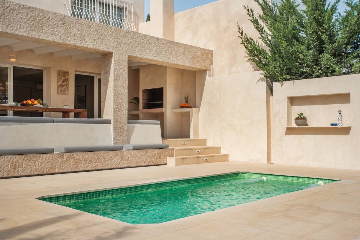 新翻修和裝飾。 私人別墅,5 間套房,最多可容納 14 張床和 3 張沙發床。 冷暖空調、電動百葉窗、USB 插座。 步行即可抵達超市、海灘和巴努斯港。 600 Mb 網路、5G WiFi、60 吋智慧電視,配備 HDMI、USB 和串流。 泳池(可選擇加熱)配有淋浴間、可容納 12 人的室內露臺、燒烤和燈光花園。 無需鑰匙即可進出、周邊警報器、保險箱。 溫水泳池、機場接送、餐飲和清潔服務(可選)。