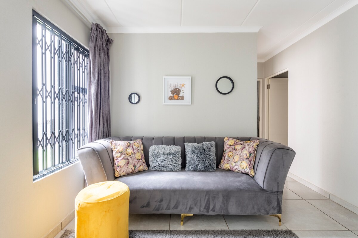 *Ideal Location* 7km from OR Tambo Airport-15min *Perfect 4 airport stayover/Buss trip* *Fully equipped Workspace with 27" Monitor, 24/7 Uncapped Wifi* * Comfort* Enjoy a plush SuperKing bed, breathtaking Bathroom and a private patio for morning coffee. *Entertainment* 55" Swivel TV with streaming services and a Weber braai area 4 outdoor dining *Explore* Padel Court 2km away. Stoneridge mall 10min 4 dining. *Amenities* Superior *Privacy* Guaranteed *Extras* Generator, Pre Paid A/C, Baby Crib