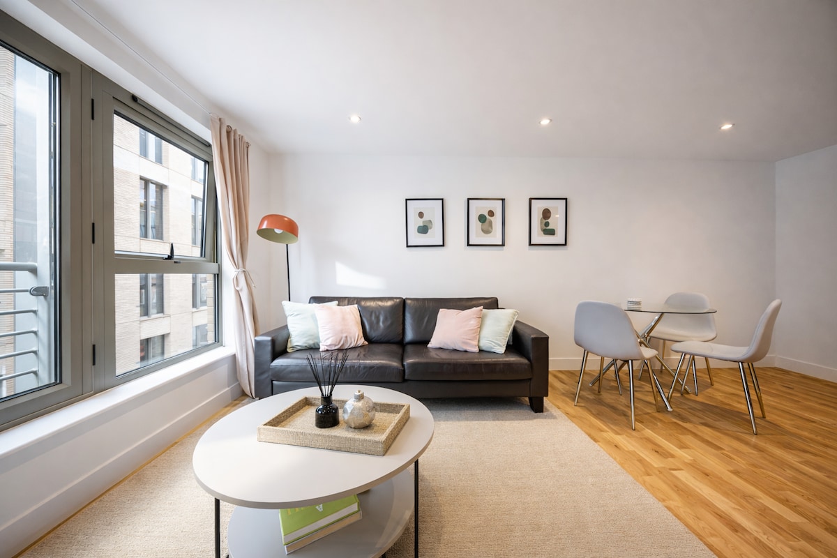 這間時尚的公寓位於倫敦最時尚、最具活力的街區之一Spitalfields。公寓是開放式的,廚房、用餐空間和休息室都在一個大空間內。有一間大臥室,配有加大雙人床、高品質的Simba床墊。第二間小臥室配有一張小型雙人床( 140公分x 190公分) ,非常適合1位成人或2位兒童入住。我們提供您需要的一切,快速 WiFi、毛巾和床單、洗衣機、洗碗機、烤箱等。