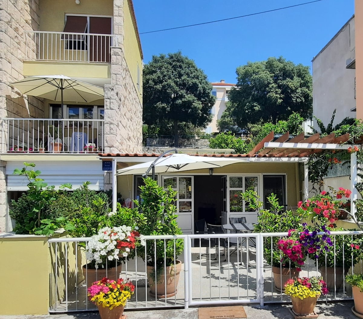 The apartment is spacious and the specialty is a large private terrace (30 m2) in front of the apartment surrounded by greenery. You can enjoy the natural shade or the shade under the umbrella. Also you can park the car on the street for free or can park in my yard, so you can enjoy their vacation without worrying about your car. The area is ideal for swimming (7 minutes to the beach) , walking, biking, climbing and marine activities,or enjoy in a short walk to the old town along the seafront.