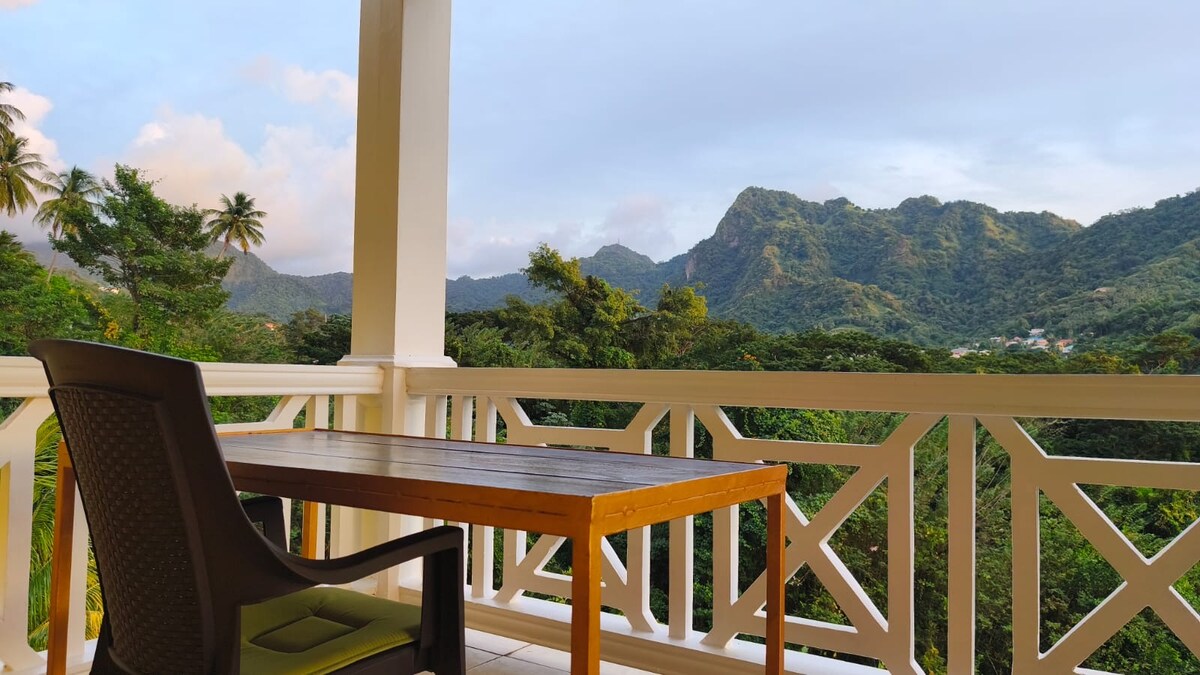 Pine house on rainforest edge Queen Bed Superior mattress Mosquito net Outstanding views valley/sea/gardens WIFI Comfortable, rustic, clean Tranquil setting Can be very windy Good for hikers, birders, yogis Daybed Hike: Vermont Trail, 'Vincy' parrot Bush Bar 10 mins. Table Rock 1 hr Drive: Superb snorkelling site 45 mins. Provided: Soap, handmade with coconut oil and no fragrance Salt, pepper Instant coffee 1 towel each Cafetiere
