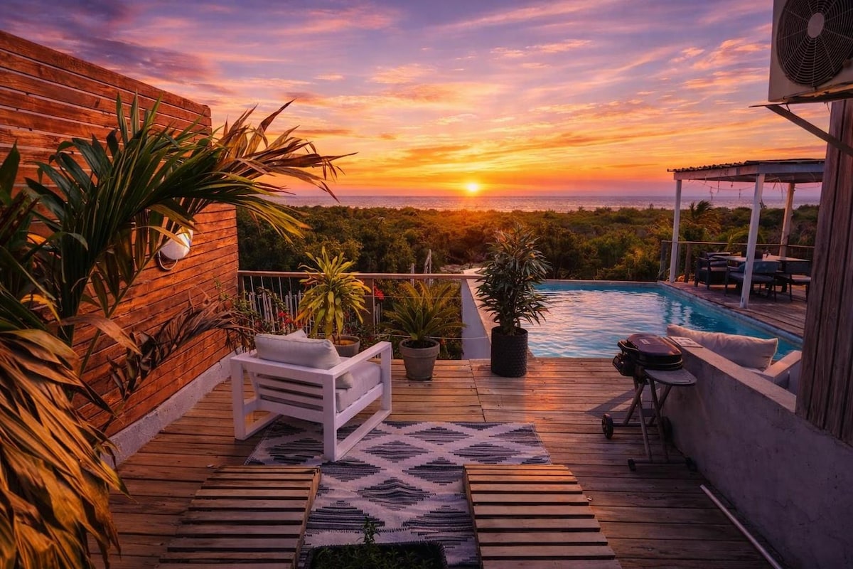 海景樓上4間臥室4間浴室(套房)、獨立入口公寓。全套私人廚房和起居區域。共用屋頂水療池、涼亭酒吧、日光浴躺椅。配備齊全,為房客提供許多免費和付費服務,包括免費WiFi。 公寓位於二樓,需要爬樓梯,屋頂泳池/涼亭也需要爬樓梯。 備用發電機